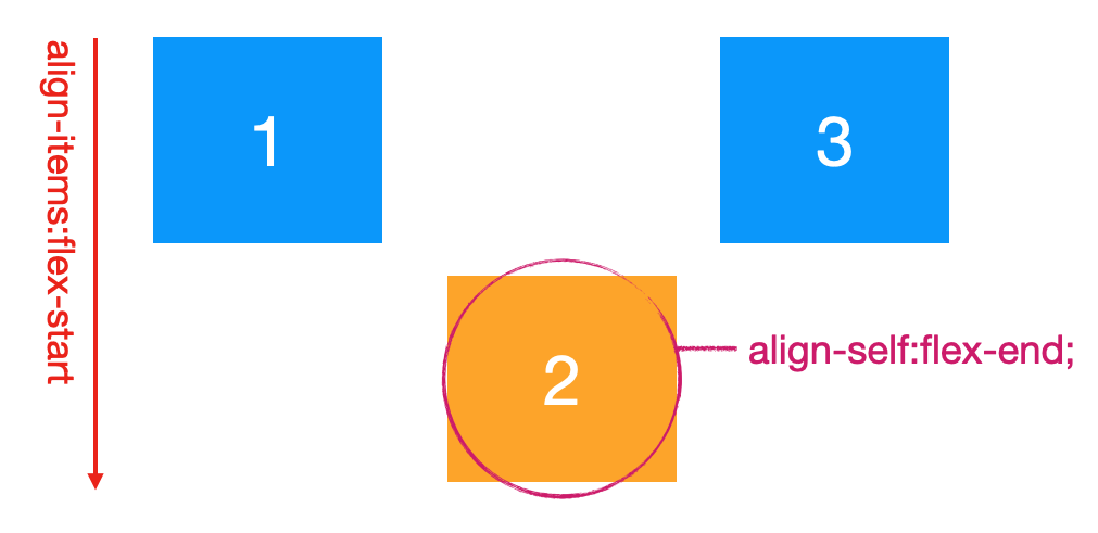 모든 박스들은 원래 align-items:flex-start 속성을 가지고 있었습니다. 하지만 2번 박스에만 align-self:flex-end; 속성을 부여하였더니 오로지 2번 박스만 flex-end에 위치하게 됩니다.