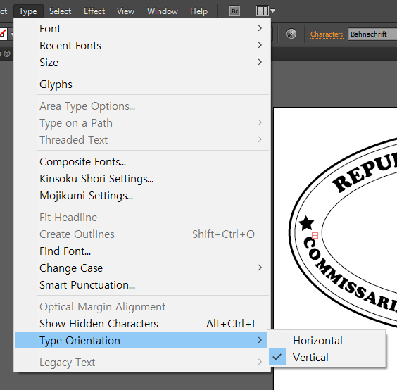 Type -> Type Orientation -> Vertical 메뉴를 누르면 세로로 변경할 수 있다.