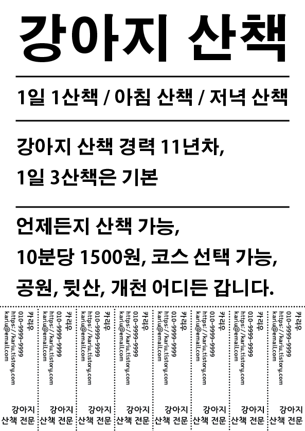 과외 전단지도 만들어보았다. 강의에서는 "디자인 과외" 전단지를 만들었는데 나는 재미있게 "강아지 산책"이라고 변형하여 제작해보았다.