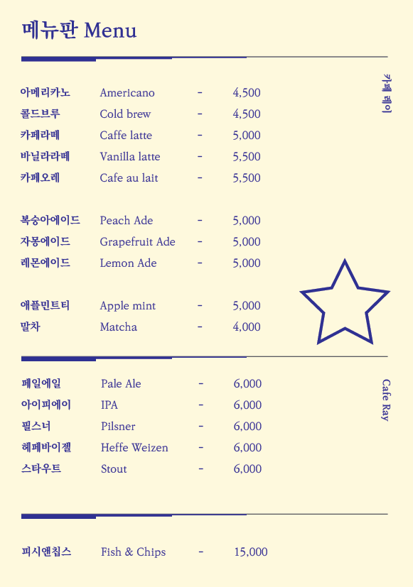메뉴판도 만들어보았다. 이번 실습은 거의 45분이나 걸렸다.