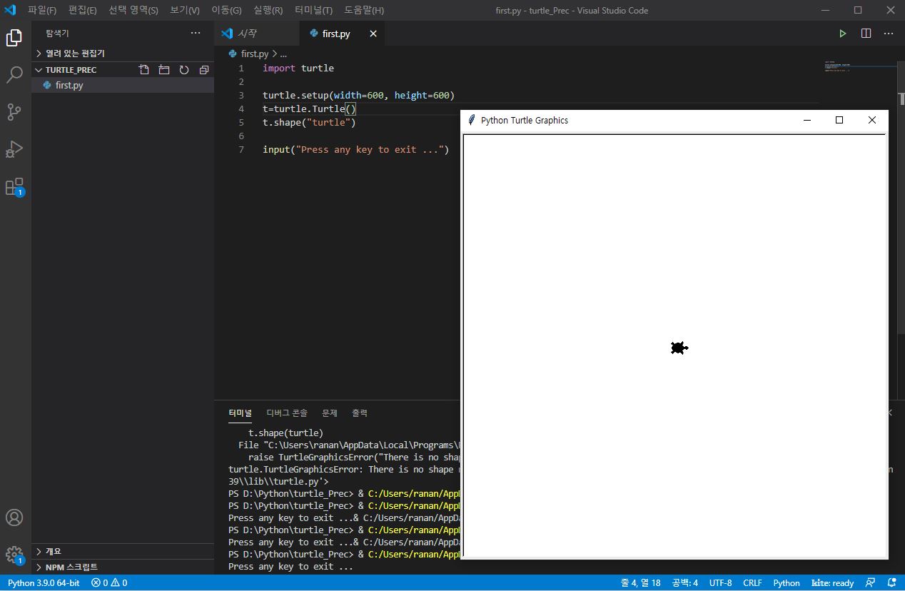 비쥬얼 스튜디오 코드에서도 터틀 그래픽이 돌아가긴하는데 안 돌아가는 경우도 있습니다. 그럴땐 맨 아래에