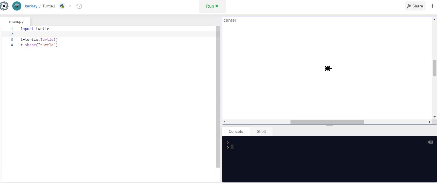 repl이라는 웹 컴파일러에서도 터틀 실행이 가능합니다. 단, 처음 프로젝트를 만들 때 turtle이 미리 깔려있는 프로젝트를 선택해주세요.